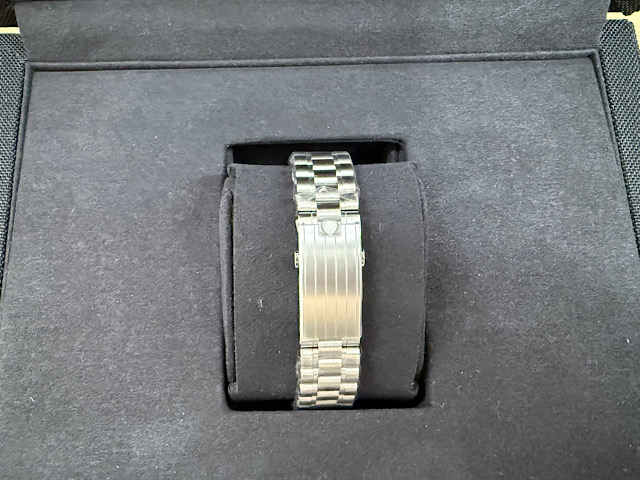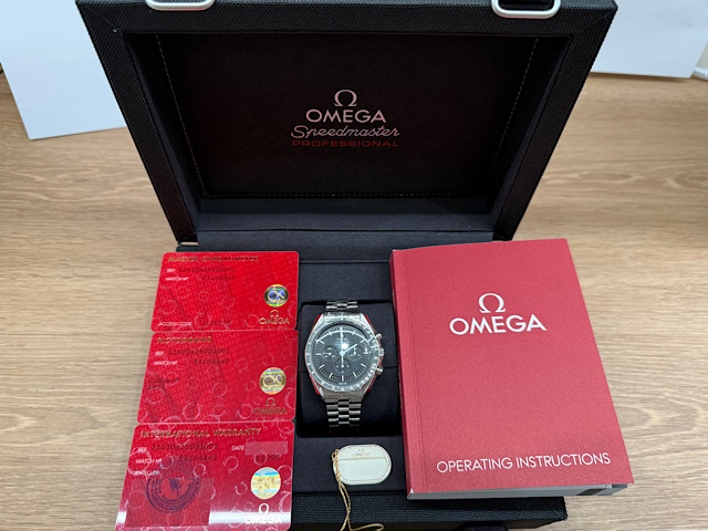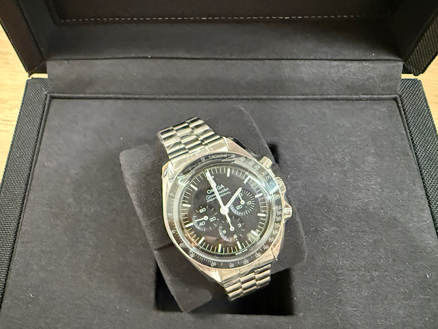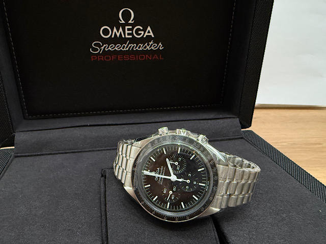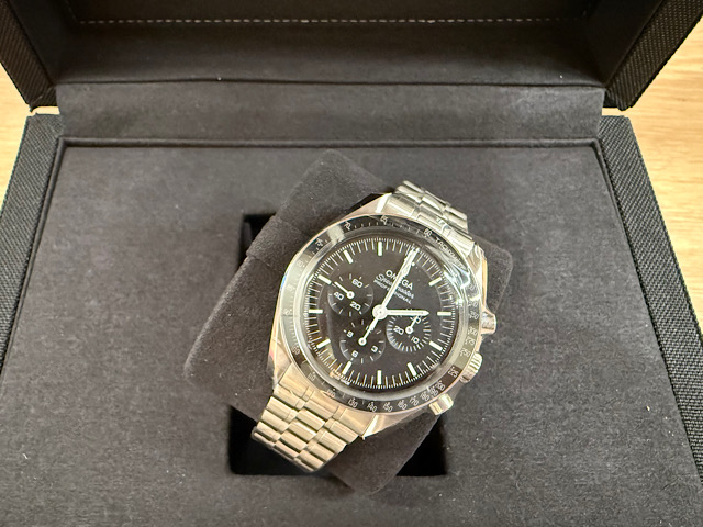 此42毫米不鏽鋼登月錶襯以每行五拱形鏈節的磨砂錶鏈,設有碳纖維玻璃正面錶鏡及浮雕海馬徽章的錶背。腕錶靈感源自曾於月球佩戴的第四代超霸腕錶風格,其設有不對稱錶殼、黑色錶盤,以及經陽極處理的鋁錶圈環飾有著名的「數字90上方圓點標誌」(Dot over Ninety)。