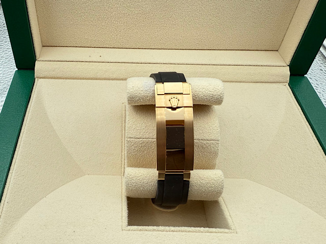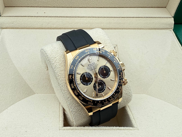 黃K金材質錶殼、錶帶、摺疊扣、旋入式錶冠 / Cerachrom黑色陶瓷視距儀刻度錶框 / 黃金底黑圈熊貓面盤、夜光指針、立體時標 / 原廠勞力士新式黑色橡膠錶帶 / 藍寶石水晶玻璃鏡面 / 防偽內圈 |