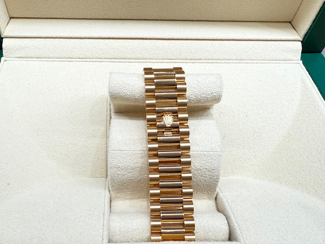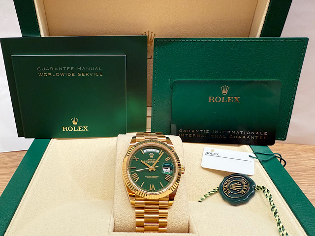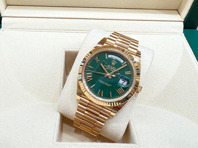 黃K金材質錶殼、摺疊扣、旋入式錶冠、經典三角坑紋錶框 / 元首型(President)錶鍊帶 / 綠色面盤 / 黃K金羅馬數字時標 / 藍寶石水晶玻璃鏡面 |