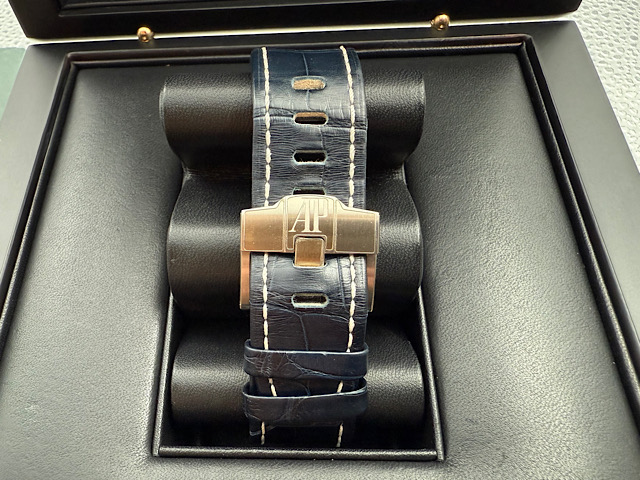 皇家橡樹獨特八角形螺絲外露設計錶框 / 不鏽鋼錶殼、穿扣、陶瓷旋入式錶冠、計時按把 / 黑色特大格紋面盤、藍色計時盤、藍色內錶圈、夜光指針、立體阿拉伯數字時標 / 午夜藍色原廠鱷魚皮錶帶 / 藍寶石水晶玻璃及透明錶背 / 22K金自動盤 |