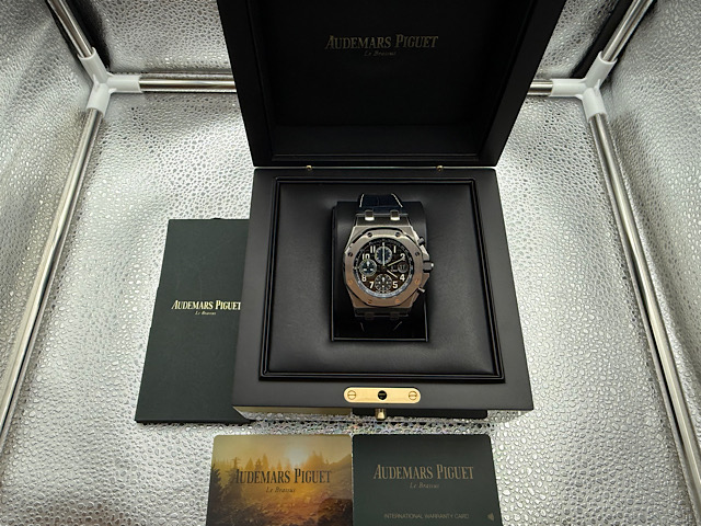 愛彼錶原廠Cal.3126/3840自動上鏈機械機芯 / 時、分、小秒針時間指示 / 放大日期窗顯示 / 60秒、30分鐘、12小時計時碼表 / 動能儲存50小時 / 防水100米 |