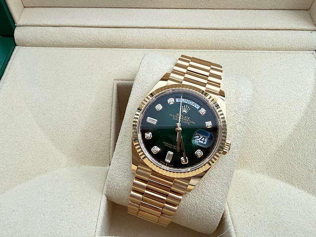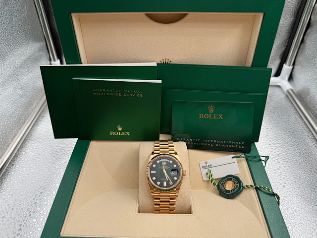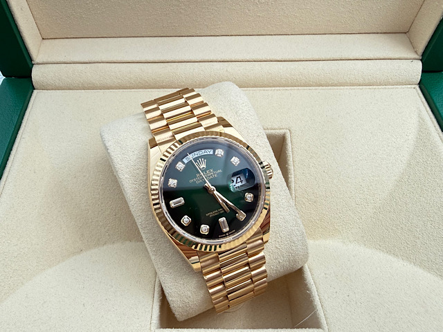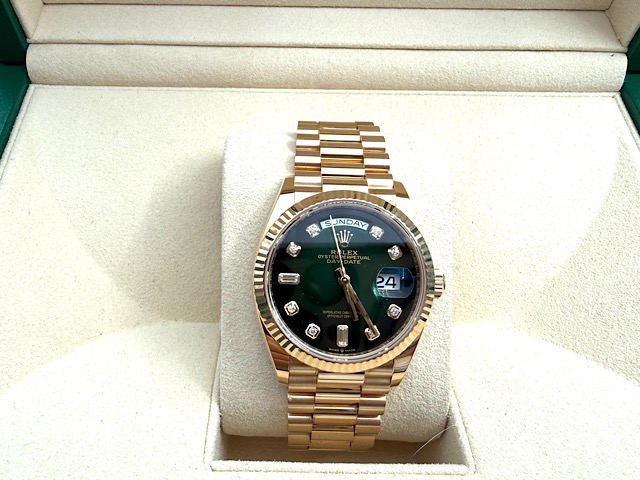 蠔式 Day-Date 36 128238 18K黃K金材質 煙燻綠色面盤 原鑲鑽石時標 2022年">
