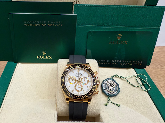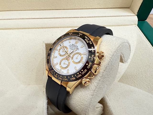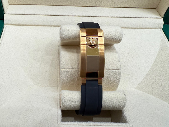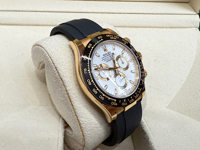 18黃K金材質錶殼、錶帶、摺疊扣、旋入式錶冠 / Cerachrom黑色陶瓷視距儀刻度錶框 / 白色面盤、夜光指針、立體時標 / 藍寶石水晶玻璃鏡面 / 防偽內圈 / 黑色橡膠OYSTERFLEX錶帶 |